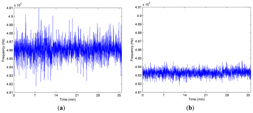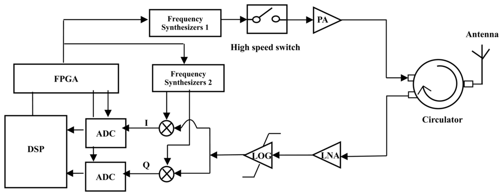 The Figure 5 depicts the block diagram of the transceiver unit. The power amplifier (PA) boots the transmitted power up to 27 dBm. The frequency difference between the transmitter and in the receiver is digitally controlled at fixed 500 kHz. The phase noise of the frequency synthesizers are within −110 dBc/Hz at 100 kHz offset. The amplifier (LOG) is used to provide an undamped output when the input signal is beyond −70 dBm due to impedance mismatching (the theoretical value is −78 dBm). When the input power of receiver unit is −98 dBm, the SNR of the signal offered to the analog-to-digital converters (ADC) is about 10 dB. The reflected echoes are converted into the digital signals by using 14 bit ADC with sampling rate of 9 Msps. The recorded data are processed using the proposed algorithm and FFT, respectively. The time sequence of the interrogation unit is well controlled so as to keep the initial phase angle of the interrogation as a constant during all the measurement processing. In the case of the Q factor is 6000 and the sensing distance is 2 m, the time length of the undamped part can be guaranteed above 15 μs. That is, the undamped part ratio in the received signal is at least 26%.