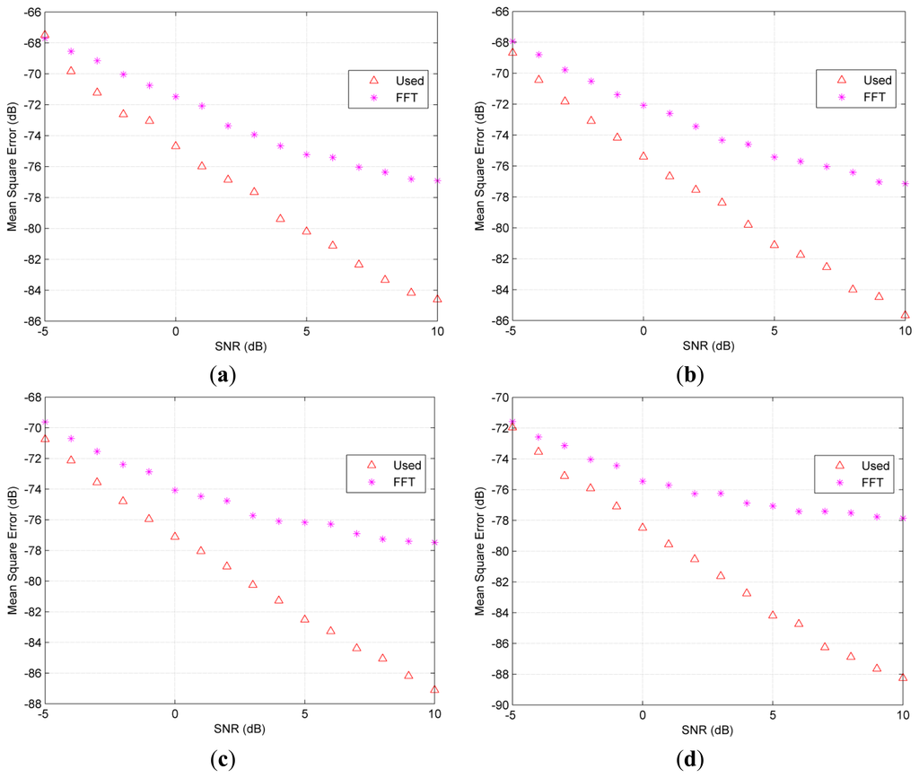 In order to evaluate the resolvability of the algorithms, the average frequency estimation of 1000 times rather than the real value of ω is specially used in Equation (12). The corresponding results for the used method and the FFT technique at different SNR levels are presented in Figure 4. It can be seen that the used algorithm exhibits smaller values of MSE than FFT method even in the short effective time length. However, for the conventional SVD based method, such as the KT algorithm, its variance is higher than the FFT method with parabolic interpolation if the signal is not too long [22]. That is, the used method shows better resolution ability. Furthermore, it indicates a longer sensing distance than using the FT method.