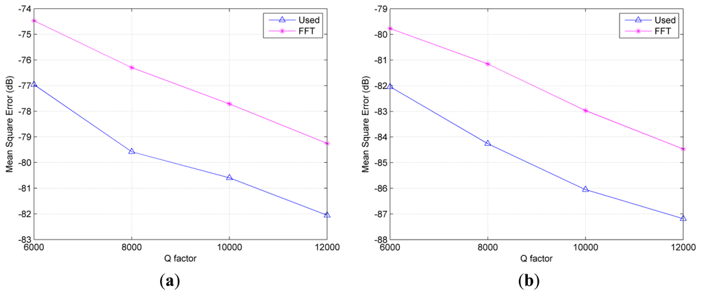 Since the resolvability of two frequencies depend on the SNR and the Q factor of the resonator, we consider the accuracy of the results over various Q factors at the given SNR. Here, the time lengths of undamped parts of the hybrid signals are all 14 μs. Since the amplitude of exponentially damped part is dependent on e−(π×fn)/Q, the bigger Q factor represents the longer effective time length.