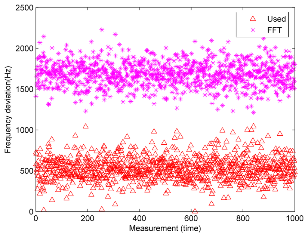 The accuracy of the used algorithm is firstly verified by an experiment, which employs a signal generator (IFR 2023A) to simulate the response signal. The transmitted power is set to −79 dBm, which is higher than the sensitivity of the practical receiver. The absolute values of the deviations from the actual frequency are shown in Figure 6. It demonstrates that the results of the used method are much closer to the actual frequency, that is, the used method has higher accuracy. The average deviations are 1.67 KHz and 529.89 Hz for the FFT and used method, respectively.