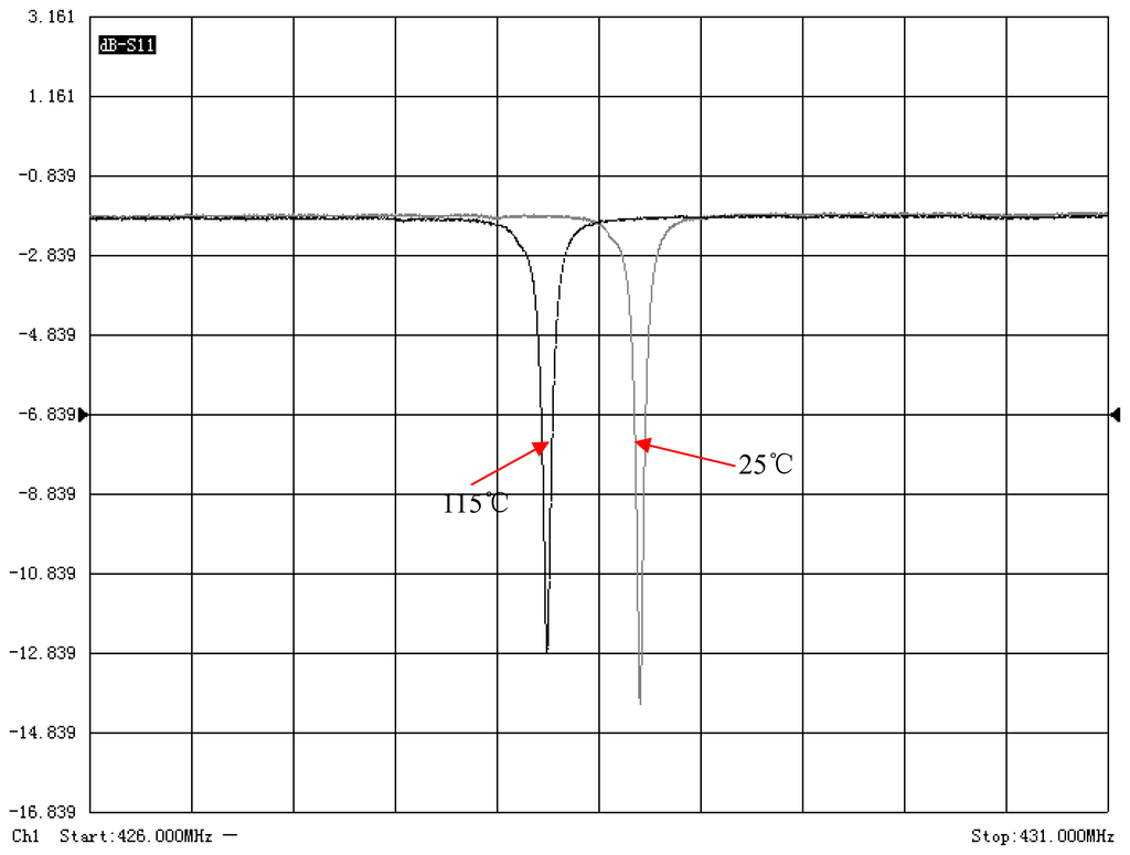 The algorithm is also validated using the actual wireless SAW resonating sensor which is made of Y-rotated 36° (AT-cut) quartz. Its thermal sensitivity can be accurately adjusted by controlling the metallization thickness (h/λ) of the SAW resonator. In our experiment, the metallization thickness of 4% is designed; thus the temperature-induced frequency shift of SAW resonators can be within 950 kHz in the range from −40 °C to +150 °C, i.e., the average temperature sensitivity of the sensor is about 4.9 KHz/°C. The measured S11 frequency responses of the SAW resonator using the vector network analyzer AV3629A are shown in Figure 7. Two curves are measured at 25 °C and at 115 °C, respectively. And the central frequency of the resonator shifts from 428.689 MHz to 428.253 MHz, which is in good agreement with the designed temperature sensitivity and the loaded Q factor also slightly decreases from 6679 to 6397. As shown in Figure 8, in this experiment, the resonant SAW sensor and the antenna are mounted on two separate tripods to keep the reading distance of 2 m.