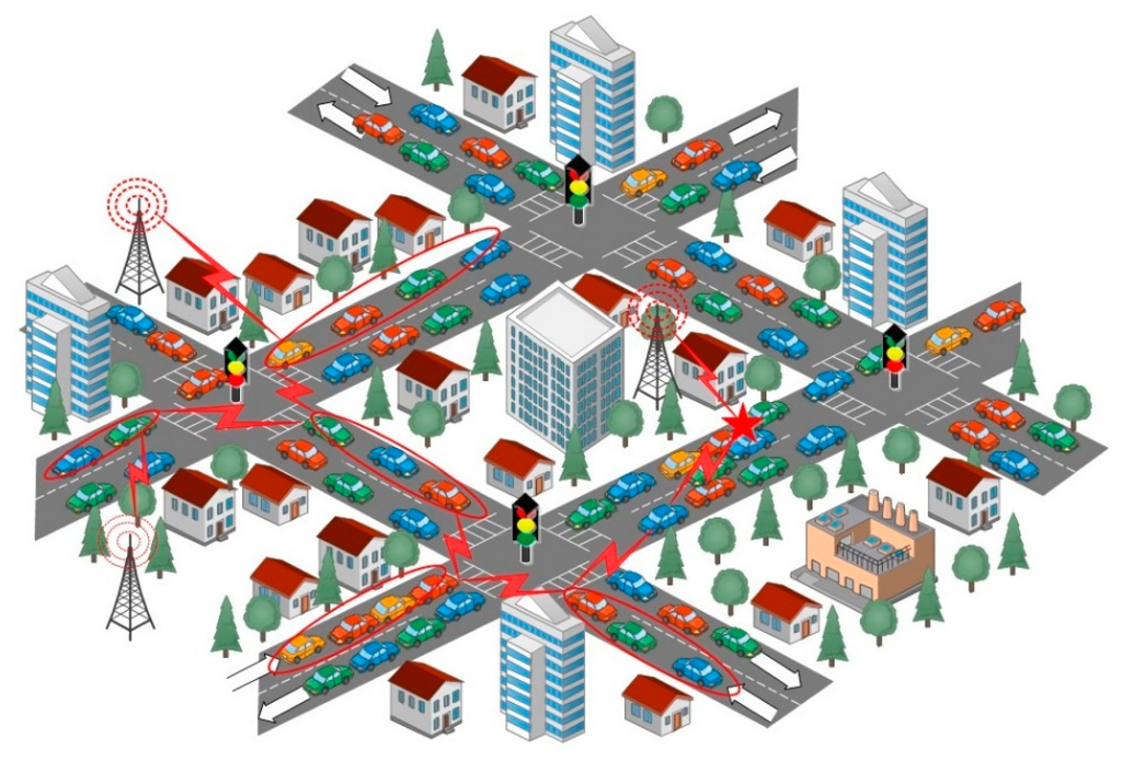 The aforementioned studies show that controlling both traffic congestion and vehicle accidents throughout the world is highly desirable. In order to achieve these goals, expensive sensors, radars, cameras and other state-of-the-art technologies have been currently incorporated into vehicles to improve safety and comfort during traveling []. Recently, Vehicle to Vehicle (V2V) and Vehicle to Infrastructure (V2I) applications have attracted more attention from industries and governments around the world because of their matchless potential to address safety and traffic congestion challenges at lower operational cost [–]. Both these applications (V2V and V2I) can also be used for commercial and vehicular infotainment [,]. In Figure 1, an example of V2V and V2I communication in Vehicular ad hoc Networks (VANETs) has been illustrated for the advancement of traffic control system and ease of travel in urban traffic environment.