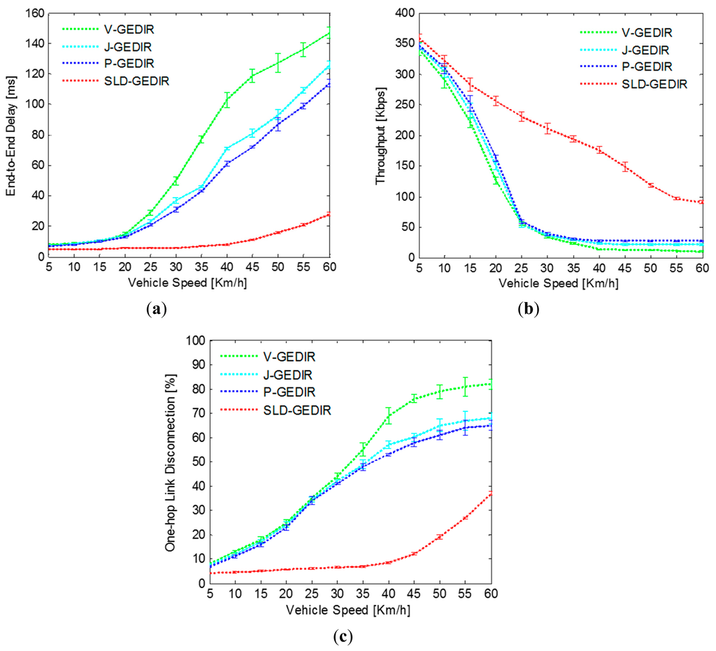 In the simulation, end-to-end delay, throughput and one-hop link disconnections have been computed for different vehicle speed values. Vehicle speed has been varied from 5 – 60 Km/h to analyze the performance of SLD-GEDIR and compare it with the state-of-the-art protocols. The result depicted in Figure 10a shows that for vehicle speed in the range 5 – 30 Km/h, end-to-end delay remains constant and is nearly 6 ms for SLD-GEDIR protocol. Further, end-to-end delay is significantly reduced for SLD-GEDIR. This can be attributed to the fact that the NHV selection process has been made unambiguous towards the most probable direction of destination in SLD-GEDIR. The performance of J-GEDIR and P-GEDIR starts degrading at a speed above 20 Km/h. The reason behind this is that J-GEDIR selects the farthest junction vehicles as next hop vehicles and P-GEDIR selects border vehicles as next hop vehicles. The farthest junction vehicles and border vehicles are prone to go out of transmission range frequently due to the high mobility of the traffic environment. The performance of all the state-of-the-art protocols is approximately same for the speed range of 5 – 20 Km/h. The performance of V-GEDIR degrades at a higher rate as the vehicle speed goes above 20 Km/h because it does not consider the speed of vehicles for selecting a forwarding vehicle. Thus the proposed protocol outperforms the compared state-of-the-art protocols.
