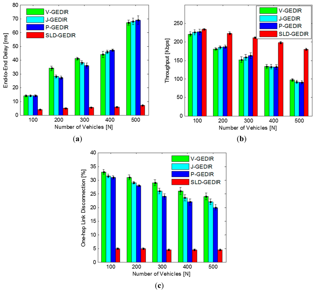 In this section, the outcome of the simulations carried out to analyze the performance of the SLD-GEDIR protocol in handling frequent changes in network topology due to the high mobility of vehicles and in managing dense vehicular network in an urban traffic environment are presented. In the simulation, end-to-end delay, throughput, and one-hop link disconnections in the network have been computed. Results obtained for SLD-GEDIR algorithm are compared with three state-of-the-art protocols: P-GEDIR, J-GEDIR and V-GEDIR.