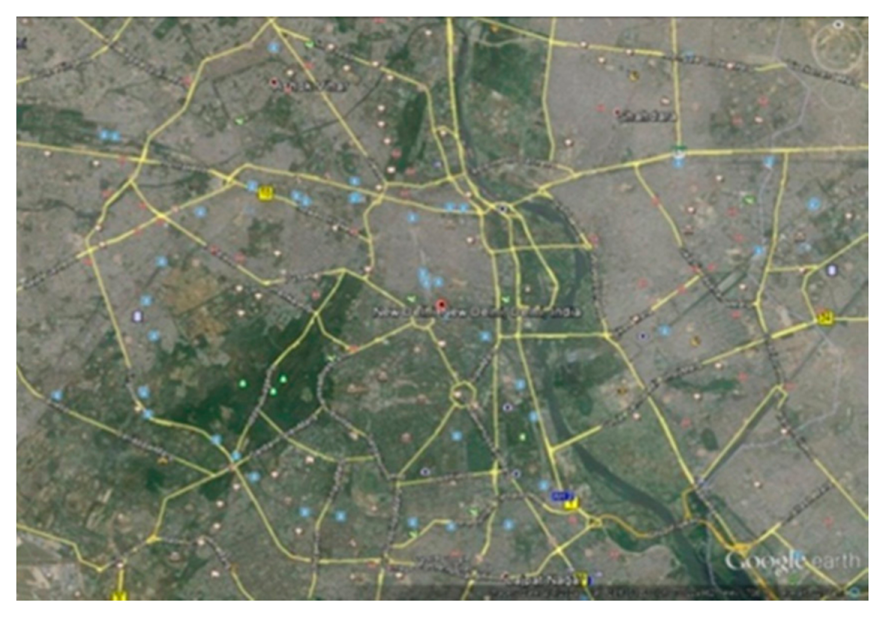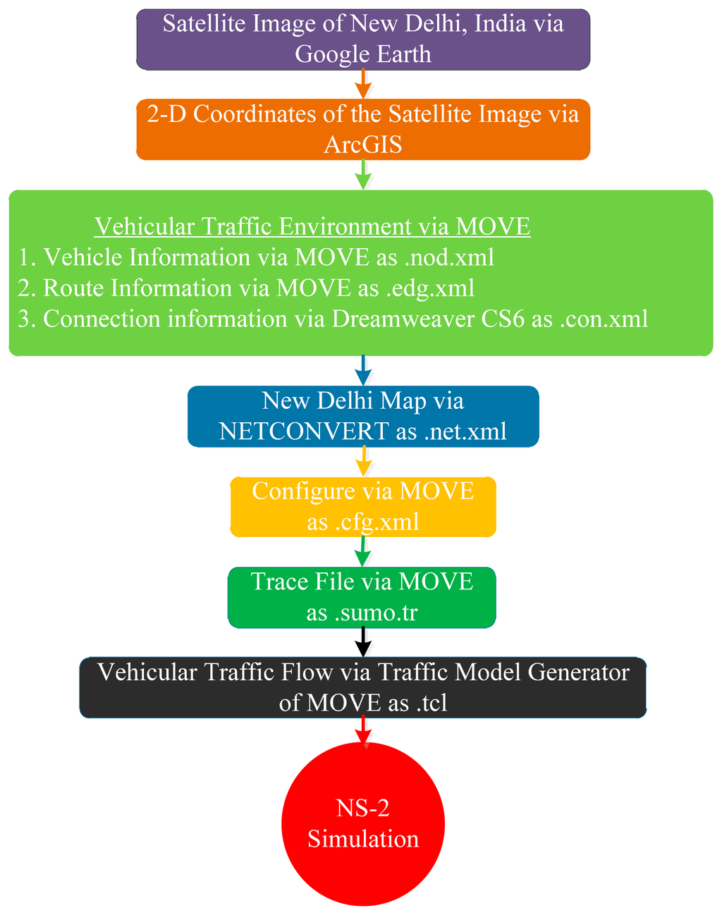 In this section, the performance of SLD-GEDIR has been analyzed considering the road network of New Delhi (India). A satellite image of the city (cf. Figure 12) is obtained via Google Earth software and it imported in ArcGIS 10.2.2 for the assignment of the road network coordinates. The city map is input to MOVE that integrates network information with the map. Thereafter, configuration and trace files have been generated and ultimately the vehicular traffic flow in the New Delhi Map has been produced to analyze the performance of the proposed protocol in a high speed and low vehicle density traffic environment. The complete process of map-based simulation has been depicted in Figure 13.