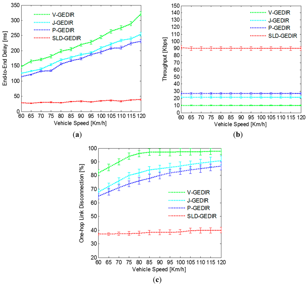 In Figure 10b, the results show the comparison of throughput between SLD-GEDIR and those of other protocols under consideration for varying speed. The results demonstrate that the throughput of SLD-GEDIR decreases linearly with increasing vehicle speed. However, the throughput decreases sharply for the state-of-the-art protocols. This can be attributed to the fact that the state-of-the-art protocols need to re-discover one-hop links more frequently because of high rate of link breakage with increasing vehicle speed. The link selected by SLD-GEDIR is based on various quality computations that make it more reliable. Therefore, SLD-GEDIR always outperforms the considered state-of-the-art protocols. The comparison result of one-hop link disconnection between SLD-GEDIR and the state-of-the-art protocols has been shown in Figure 10c. It can be clearly observed that one-hop link disconnection of SLD-GEDIR is nominal in comparison with the state-of-the-art protocols with the speed range of 5–40 Km/h. The reason behind this is that the degree of connectivity and the one-hop link quality prediction selects the most reliable NHV in the proposed protocol. However, the one-hop link disconnections suddenly increase at speeds above 40 Km/h because the NHV selection process could not be completed within the available time. P-GEDIR is the next best performer in terms of number of one-hop link disconnections compared to J-GEDIR and V-GEDIR. The one-hop link disconnections in P-GEDIR and J-GEDIR start growing rapidly at speeds above 20 Km/h because the forwarding technique used in these protocols does not consider speed information in NHV selection. V-GEDIR performs the worst as compared with other protocols for all speed ranges due to its larger hop count from source to destination region. Thus, the performance of SLD-GEDIR is better than the compared state-of-the-art protocols in terms of one-hop link disconnections.