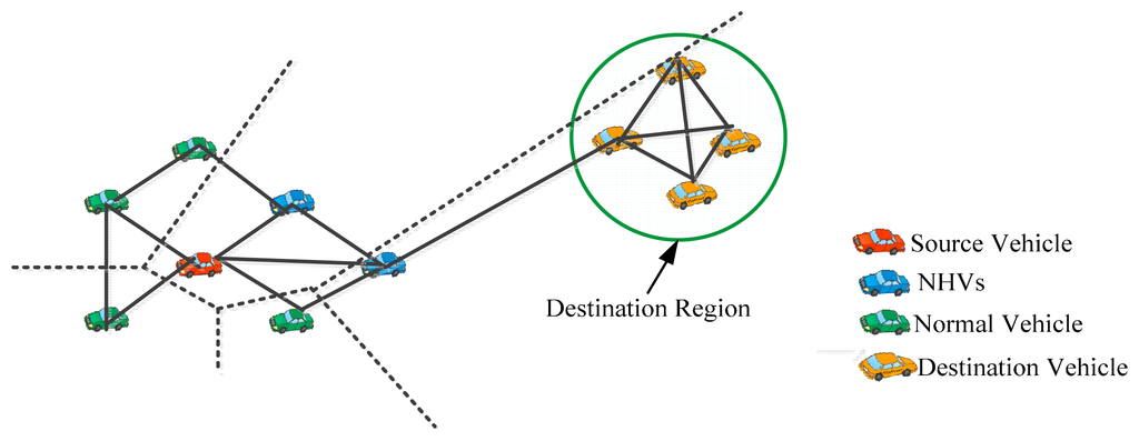 Voronoi Diagram based Geographic Distance Routing (V-GEDIR) [], is an extension of GEDIR. In this paper the authors have presented a loop-free position-based routing algorithm. In the V-GEDIR algorithm, NHVs are selected as vehicles whose Voronoi region either covers or cuts the expected destination zone. This method can be used for both routing and geocasting. An example of the NHV selection process using V-GEDIR is shown in Figure 2.
