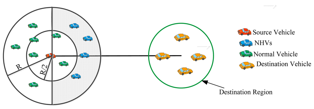 In V-GEDIR, node mobility is not considered during the formation of a Voronoi diagram, which limits the applicability of the approach in highly mobile networks such as VANETs. In [], the authors have suggested a Junction-based Geographic Routing (J-GEDIR) protocol for VANETs. In the protocol, an on-road vehicle passing through a junction point, closest to the destination and making smallest angle with the source vehicle has been selected as next hop vehicle. The greedy forwarding based on distance selects border nodes as NHVs that degrade the performance of the protocol in a high speed vehicular environment due to non-inclusion of link quality in the consideration. In Peripheral node-based Geographic Distance Routing (P-GEDIR) [], all vehicles present inside the circular strip of width R/2 (R is the transmission range of a vehicle) towards the destination are referred to as peripheral vehicles. Peripheral vehicles are considered as NHVs. In a high speed vehicular environment such as a highway, selecting peripheral nodes as NHVs limits the performance of P-GEDIR due to the high outage probability of peripheral nodes. These protocols are not suitable for dense VANETs which do not include link quality into the consideration and their performance starts degrading with the increasing speed of vehicles. An example of NHVs selection process using P-GEDIR is shown in Figure 3.
