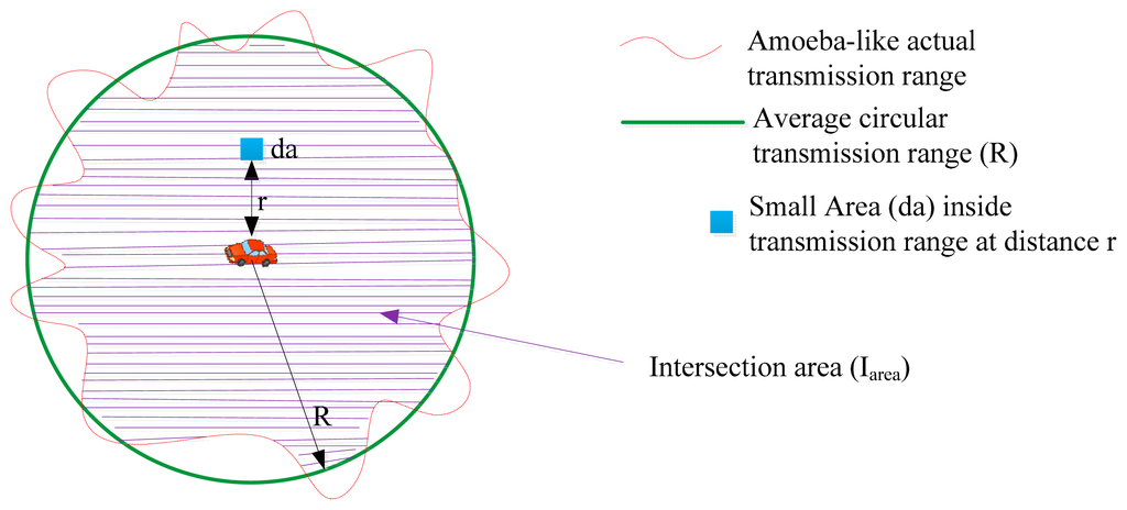 As shown in Figure 5, a small incremental area da at distance r can be used to find the intersection area Iarea between the circular transmission range and then amoeba-like transmission area. In Iarea received power, PWr always remains above the minimum required power PWmin to decode a signal. Iarea can be calculated as given in Equation (8):