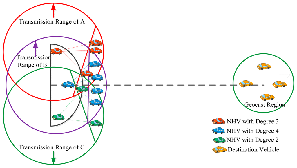 Efficient and reliable information distribution is one of the most challenging tasks in VANETs due to their highly dynamic network environment [,]. Recently, various geographic routing protocols have been suggested in the literature [–]. Geographic routing is also known as geocast routing or position based routing. The idea of geocast routing came from the Unix-to-Unix Copy (UUCP) Mapping project [], which aimed at relating IP addresses with geographic locations by maintaining a database of geographic locations of each Internet hosts. The projects, Domain Name Server (DNS) encoding of geographic locations [] and Internet Message Access Protocol Uniform Resource Locator (IMAP-URL) scheme [], were also aimed at associating geographical locations of each host with host name. The above three projects made it possible to identify the geographical locations of in-coming data flows but directing out-going data flows to geographical locations was not possible. Geographic Routing was first suggested in [] through the Cartesian routing that uses longitude and latitude information of node as address. In Cartesian routing, greedy forwarding technique has been used to forward packets to the neighbor nearest to the destination using geographical information of neighboring nodes.