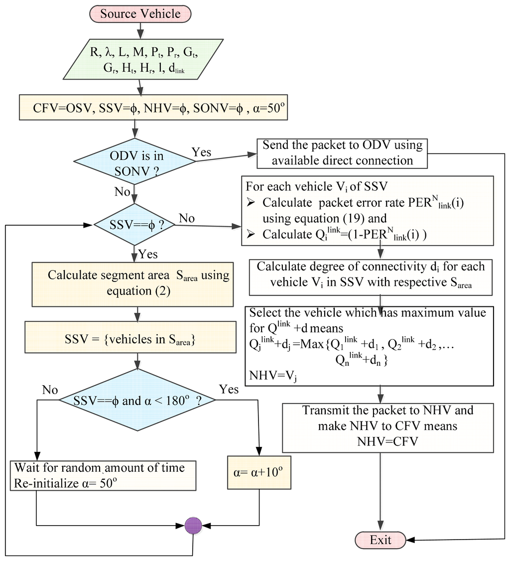 The three most preferred and recent geographic routing protocols are Voronoi diagram-based Geographic Distance Routing (V-GEDIR) [], Junction-based Geographic Distance Routing (J-GEDIR) [] and Peripheral node-based Geographic Distance Routing (P-GEDIR) []. These state-of-the-art protocols have been investigated and considered for comparative analysis in this paper. V-GEDIR selects the next hop nodes in a Voronoi region towards the destination and J-GEDIR selects junction nodes within the transmission range as next hop vehicles. P-GEDIR vertically divides the circular coverage region into two half-circular sections and selects all the border nodes as next hop vehicles from the half-circular section towards the destination. These protocols reduce the size of the forwarding region for selecting a smaller number of next hop vehicles. The performance of these protocols starts degrading with higher vehicle density and speed in the reduced forwarding region. Further, these protocols select border vehicles as next hop vehicle to minimize the number of hop count from source to destination, but the border vehicles have higher outage probability during forwarding due to the high vehicle speed in vehicular traffic environment. In urban environments, the quality of links is highly affected by obstacles such as buildings, trees, etc. These protocols ignore the link quality consideration in next hop vehicle selection.
