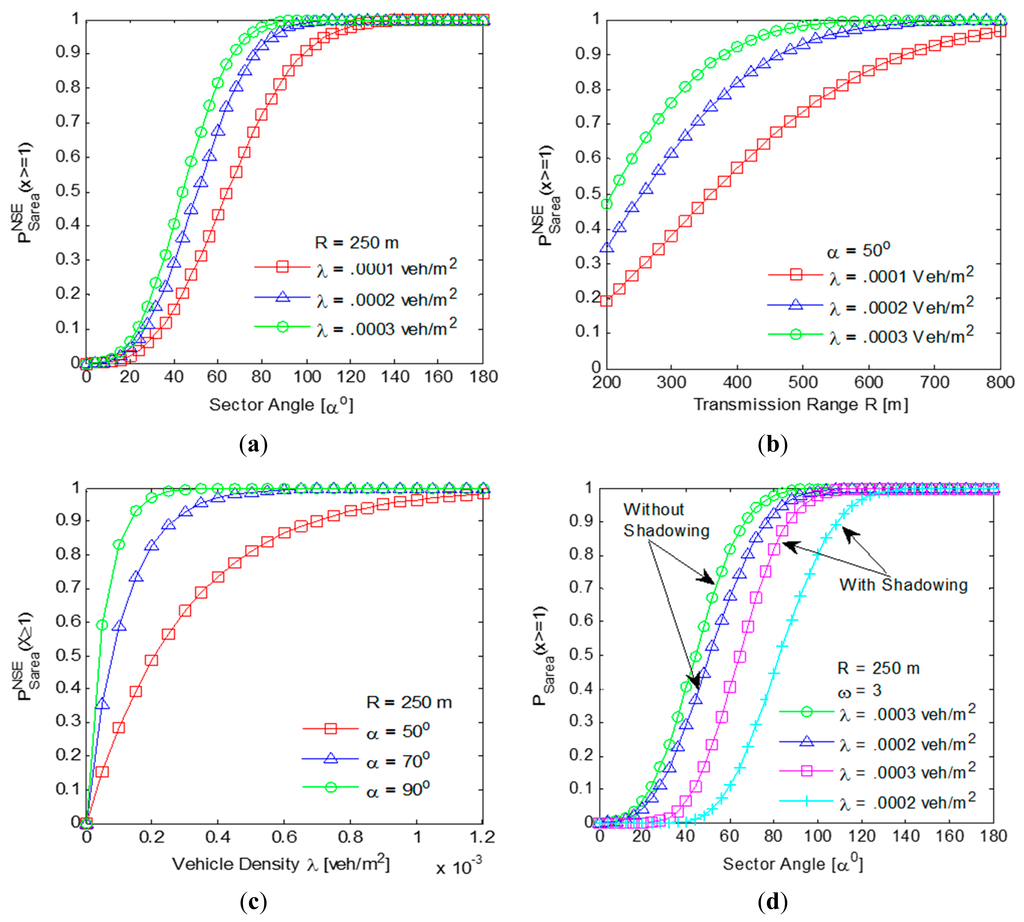 From the results depicted in Figure 8a, it can be clearly observed that for the offset angle α = 50°, the probability of presence of at least one vehicle in the segment area in a non-shadowing environment is 0.7 for a vehicle density λ = 0.0003 vehicles/m2. The value α = 50° has been considered as a minimum threshold to analyze the performance of SLD-GEDIR. The results depicted in Figure 8b clearly indicate that for each of the vehicle densities considered, the probability of the presence of at least one vehicle in the segment area in a non-shadowing environment is equal to or greater than 0.7 for the transmission range of 500 m or above. This result has been used to analyze the performance of SLD-GEDIR. The results in Figure 8c show that for sector angle α = 50°, the probability of the presence of at least one vehicle in the segment area in a non-shadowing environment is about 0.7 for a vehicle density λ = 0.0003 vehicles/m2. Moreover, for any particular value of the vehicle density considered, the probability increases with the increase in sector angle. For example, at α = 90°, the probability achieves the maximum value of approximately 1.0 for λ = 0.0003 vehicles/m2. The impact of shadowing on the probability PSarea (X ≥ 1) of the presence of at least one vehicle in the segment area has been shown in the results depicted in Figure 8d. It clearly reveals that the impact of shadowing is high for a smaller sector angle (≤ 40°) but with the increase in sector angle (≥ 60°) the impact is reduced drastically.