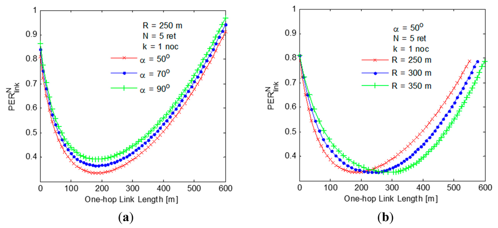 The results depicted in Figure 9a show that is lowest with a link length of 200 m for each values of sector angle that has been considered. This observation has been used for the selection of NHVs with the best quality link. The results also reveal that the vehicles belonging to the border area are not the best NHV choice as considered in the state-of-the-art protocols since the probability of going out of transmission range is higher for border vehicles. This outcome has been further validated by the other results given in Figure 9b. The results shown in Figure 9b clearly convey that for a better quality one-hop link, the NHV must be a vehicle present well-inside the segment area but not at the border of the segment area. For example, when R = 250 m is considered, the length of the best quality one-hop link is found to be approximately 200 m.