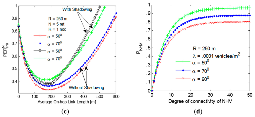 The results in Figure 9c show the impact of shadowing on . It can be clearly observed that the impact of shadowing increases drastically as soon as link length becomes larger than 200 m. As soon as the length of one-hop link approaches towards R = 250 m, increases faster due to higher probability of border vehicles going out of range. The results depicted in Figure 9d show that the probability of finding an NHV increases with the increase in degree of connectivity. Moreover, it also suggests that smaller sector angles give better performance with less number of next hop vehicles. This can be attributed to the fact that the probability of forwarding towards the destination becomes higher with smaller sector angle.