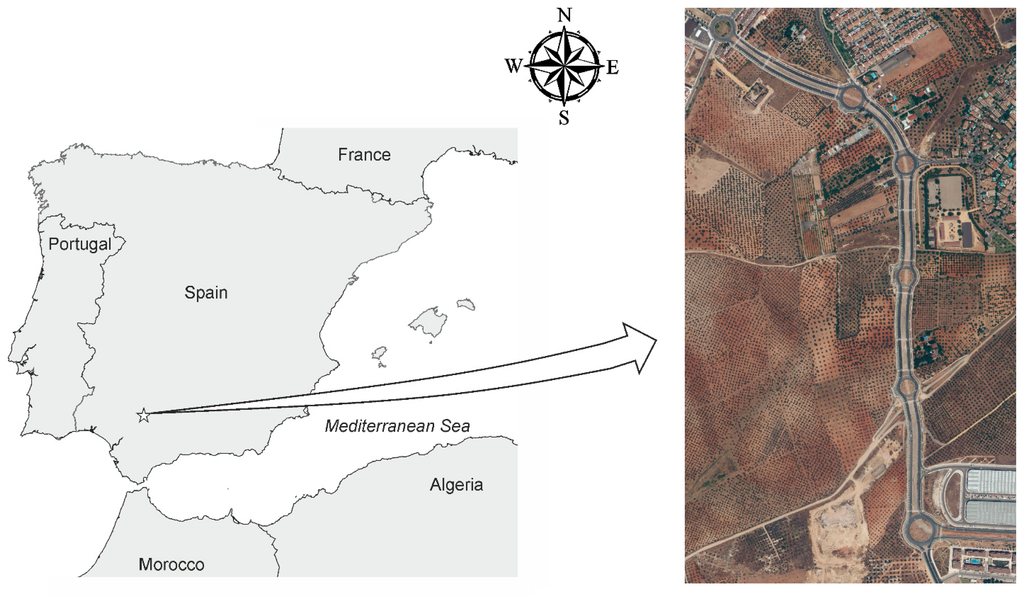 The study was performed in Mairena del Aljarafe, in Seville province, southern Spain (37°21′N, 6°04′W). The area comprised a road with a soft slope and a length of 1.6 km between two urban areas. It included many planimetric details of interest to assess the spatial accuracy of the UAV orthophoto (Figure 1).