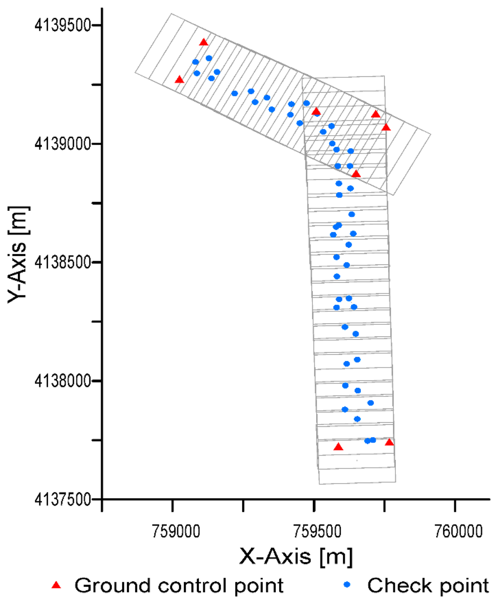 We used rapid static positioning to obtain the GCPs for use in aerial triangulation. Baseline length was about 15 km. For each point, the observation time was 15 min, with an update rate of one-second intervals. We measured a total of eight GCPs, located on the corners of each strip (Figure 2). We used fifty check points to assess spatial accuracy, measured with the Stop & Go technique for relative positioning with GPS, applying the Networked Transport of RTCM via Internet Protocol (NTRIP). The check points had a random and well-spaced spatial distribution (Figure 2). Twenty percent of the points were located in each quadrant of the working area, and the distance between points was at least 10% of the diagonal distance across the rectangle that enclosed the working area. All the check points were well-defined points in order to clearly identify them over the orthophoto. Check points were used in an external direct quality evaluation using different tests described below, in Section 2.3.