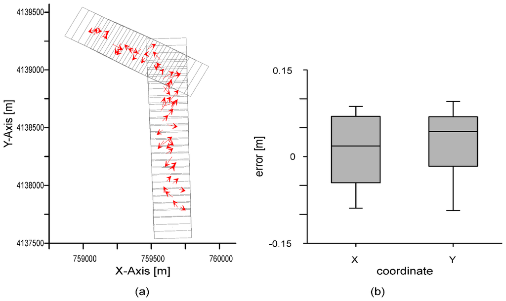 The results of the five methods analyzed are presented in this section. The comparison between the coordinates of points extracted from the UAV orthophoto and their counterparts obtained with the GNSS receiver (i.e., check points) showed a mean error of 0.012 and 0.022 m and a RMSE of 0.058 and 0.056 m for coordinates X and Y, respectively. Therefore, both coordinate components had errors in the same interval. Figure 3a shows the distribution of vector errors for each point. A priori, the spatial distribution of errors showed a random behavior, with no trends in the direction or orientation of the vectors. The magnitude of errors was also similar. Figure 3b shows a box-plot graph of the errors in each coordinate. Maximum and minimum errors in the X and Y axes were similar and did not exceed 0.10 m. This value amounts to twice the GSD of the UAV flight. In a previous stage, we noted that the orthophoto did not have outliers and all the errors passed the interquartile range rule, so all the measurements were used in the various tests we applied.