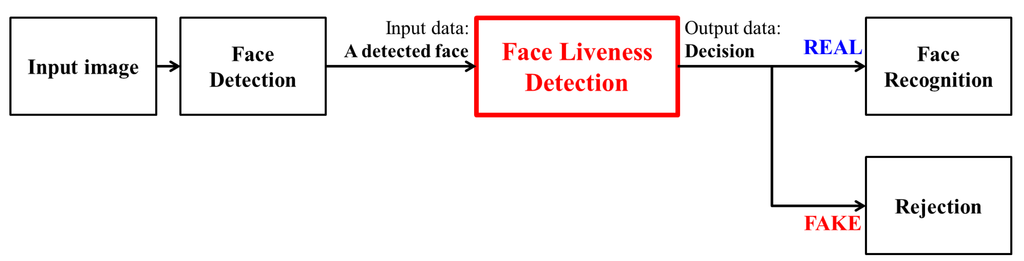 Face liveness detection (or face spoofing detection) is a process to determine whether a detected face is real or not before a face recognition system identifies the face, as illustrated in Figure 1. It prevents the face recognition system from making a wrong decision. There are several types of spoofing faces, such as 2D printed photos, videos, high-definition (HD) tablets, 3D masks, and so on. Among them, 2D photos are used widely because they are easy and cheap to obtain. To minimize the vulnerability against 2D attacks, researchers have shown steady progress in developing anti-spoofing technologies based on features of 2D photos [5]. There are some characteristics in recaptured 2D photos. First, detailed components and sharpness are lost. In this case, researchers analyze texture and frequency components in the input data. In order to represent the textural feature, local binary patterns (LBP) are often used [6,7]. On the other hand, some methods detect high frequency components and look into power spectrum [6,8–12]. Although feature domains are different, those studies approach to the solution in terms of texture. Second, there is a difference in light distributions on a face. This approach focuses on skin reflectance of real and fake faces. Tan et al. [13] and Zhang et al. [14] utilize a Lambertian model to pull out the information for finding fake faces. Bai et al. [15] calculate specularity components from the input data. Huang et al. [16] perceive the change of artificial shadows on a face. Third, 2D spoofing faces have little motion, compared to real faces. Signs of liveness are perceived in image sequences of real faces, but not in those of fake faces. This can be a clue to distinguish motionless fake faces. Several research papers [17–19] concentrate on eye blink and movement. In addition, facial movements are helpful to analyze the differences between real and fake faces [20–24]. Komulainen et al. [29] suggest a countermeasure with the fusion of motion and micro-texture analysis methods. The last approach is based on 3D facial information. The obvious difference between a real face and a 2D photo is the presence or absence of depth information. Researchers have classified spoofing attacks by considering the depth feature. Lagorio et al. [25] and Wang et al. [26] present a solution based on 3D facial shape analysis. Kim et al. [27] propose a method using a difference between degrees of variable focusing.
