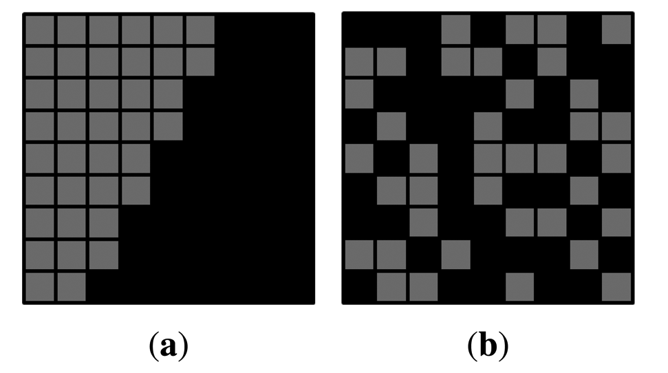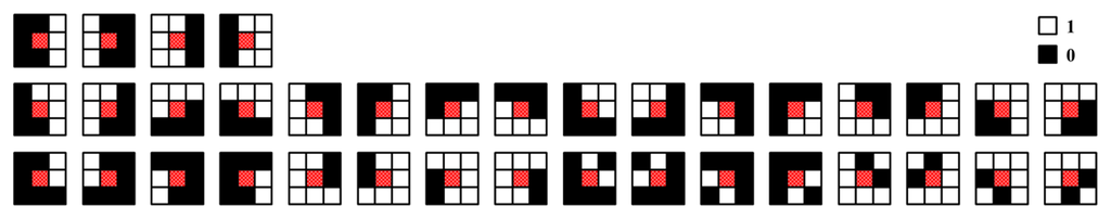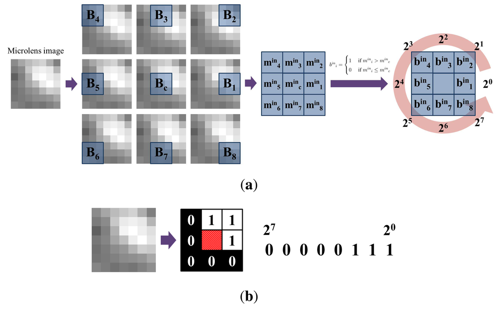 As mentioned in the previous section, there is a change in light distributions of the microlens image located at the defocused edge. In order to inspect the lighting variation, we may calculate variances of microlens images. However, the variance of the entire microlens image is not a distinguishable feature. Figure 9 shows an example. There are two microlens images. Both Figure 9a,b have the same pixel values. However, Figure 9a is clearly divided into two regions, while Figure 9b has a random distribution of pixel values. Both variances of those images are same, but the appearances of them are different. Therefore, the variance of the entire area cannot become a criterion to discriminate various light distributions in microlens images. To solve this problem, we analyze the microlens image locally adopting a local binary pattern (LBP) [51,52].