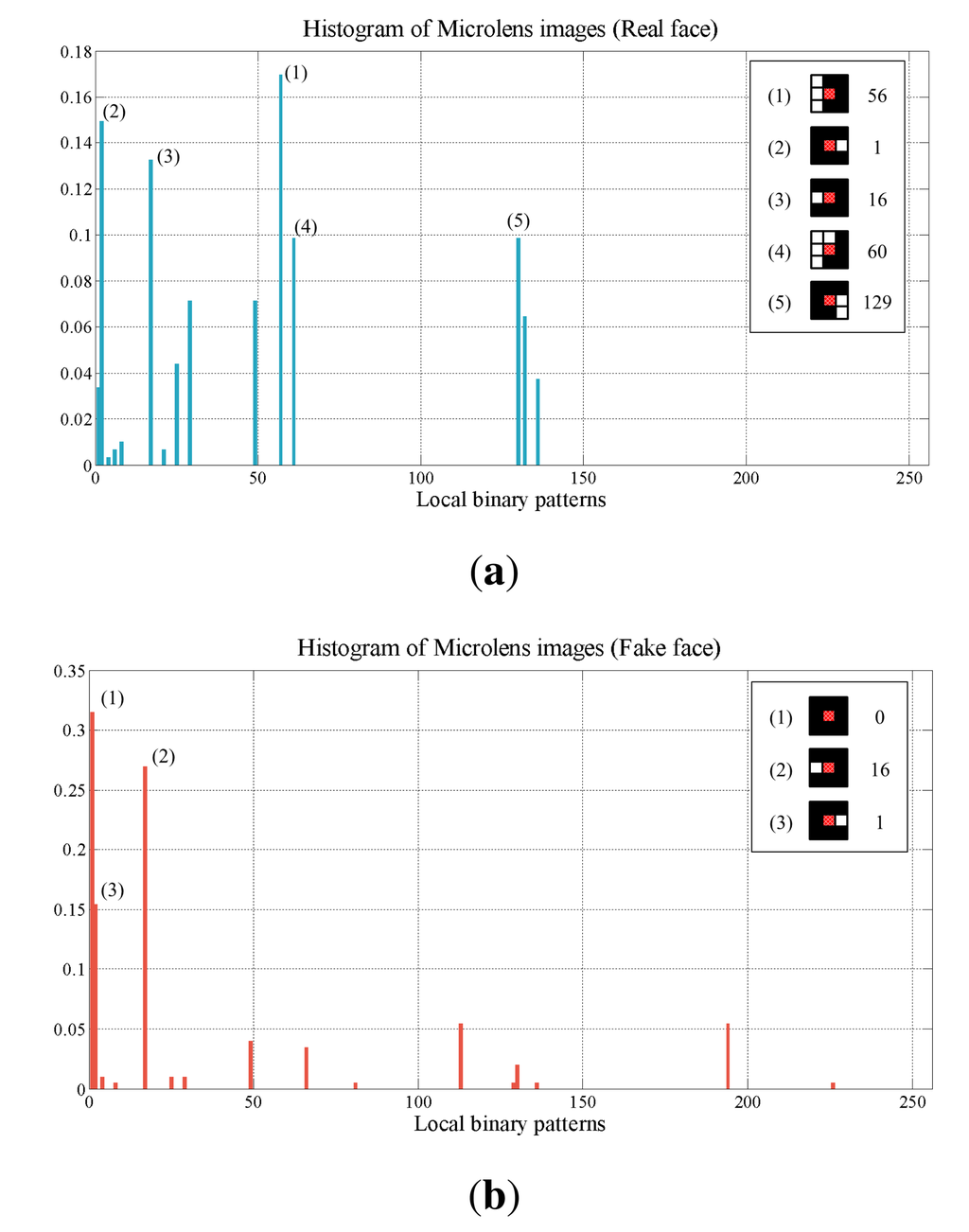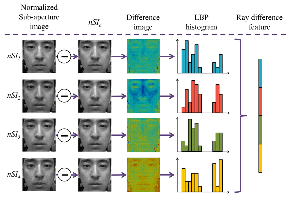 At first, five sub-aperture images are made from the light field photograph. Figure 16 shows five sub-aperture images. Figure 16a is a sub-aperture image composed of center pixels of microlens images, and Figure 16b represents four sub-aperture images composed of adjacent pixels of microlens images. Five sub-aperture images have different viewpoints and information of light rays because different pixels are chosen in microlens images. In order to check the changes in lighting, we subtract the center sub-aperture image from adjacent sub-aperture images. In Figure 17, four difference images are depicted. Images in the first and second columns are normalized sub-aperture images. Face normalization [53] is the geometric normalization based on eye coordinates. Images in the third column are difference images between the center sub-aperture image and adjacent sub-aperture images. Depending on the directions of the incident rays, each difference image has diverse distributions. In order to analyze the ray difference, we extract local binary patterns (LBP) [51] from the difference image. Figure 18 illustrates the procedure of extracting LBPs from the difference image. The difference image is divided into several subregions with allowing the overlap between subregions. Each subregion yields one histogram. This histogram represents the distribution of uniform and rotation-invariant patterns at the local subregion. The dimensionality of the histogram is 59. In the final stage, we concatenate histograms extracted from four difference images as described in Figure 17. The dimensionality of the concatenated LBP histogram is 4 (= the number of the difference images) × NP (= the number of subregions per a difference image) × 59 (= the dimensionality of a LBP histogram). To reduce the dimensionality, PCA is applied.