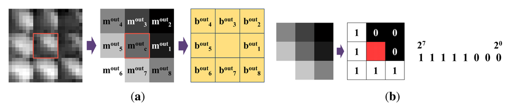 Outer binary pattern (BPout) is made by comparing the microlens image with surrounding microlens images. The left image in Figure 13a represents microlens images. 8-neighbor microlens images are used. The middle image in Figure 13a is a set of averages of microlens images. moutc is the average of the center microlens image, and mouti(i = 1, …, 8) are averages of surrounding microlens images. When the average is computed, the 7 × 7 region in the microlens image is used. Like the inner binary pattern, the outer binary pattern is obtained through the comparison with averages of adjacent microlens images. Equation (2) represents how to make the outer binary pattern. px is an intensity of each pixel, and MIi is the ith microlens image. Figure 13b shows the outer binary pattern.