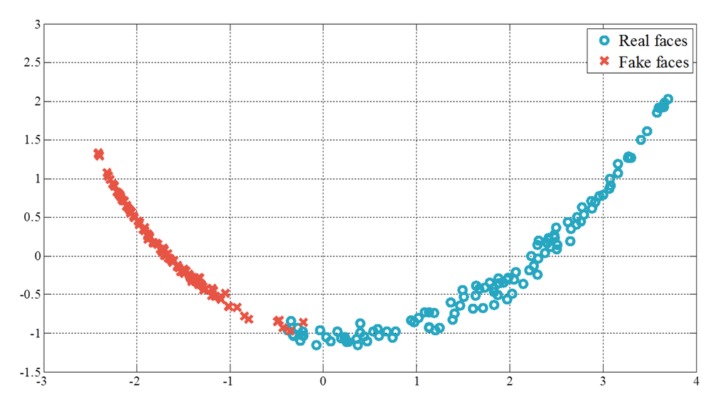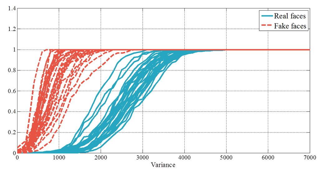The number of the microlens images, chosen in the edge detection step, is different in every input data. Therefore, it is difficult to compare arrays of variances directly in case the lengths of arrays are not the same. To make a comparison among arrays of variances, we build histograms of variances and calculate cumulative distributions of those histograms. The histograms are normalized to 1. Figure 14 shows cumulative distributions of histograms. Blue solid lines present the results of real faces, and red dotted lines show those of fake faces. Variances of fake faces are massed in the lower region, but those of real faces are not. In the final step, principal component analysis (PCA) is applied to the cumulative distributions and their representative eigenvectors are found. By projecting the cumulative distributions onto those eigenvectors, we can obtain new features and utilize them as edge features. Distributions of the edge features are presented in the Figure 15.