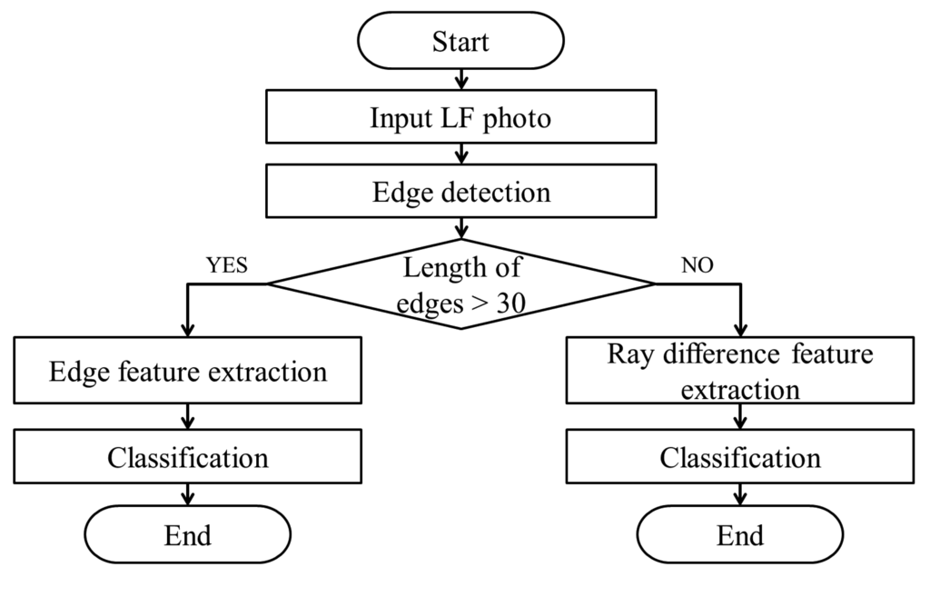 We classify fake faces using edge and ray difference features. When both features are applied, the process of classification is a parallel structure as illustrated in Figure 19. According to the length of detected edges, which feature is extracted is determined. If the length of the edge is too short, it is difficult to decide whether the input face is real or not, because of the lack of the information. Therefore, if the quantity of the edge is not enough, we extract ray difference features and utilize them to distinguish fake faces. Support vector machine (SVM) is used for a classifier. Even though edge feature can be classified with a linear classifier, ray difference feature cannot. Radial basis function (RBF) is used as a kernel, and sigma values are adjusted depending on the distribution of features [54].
