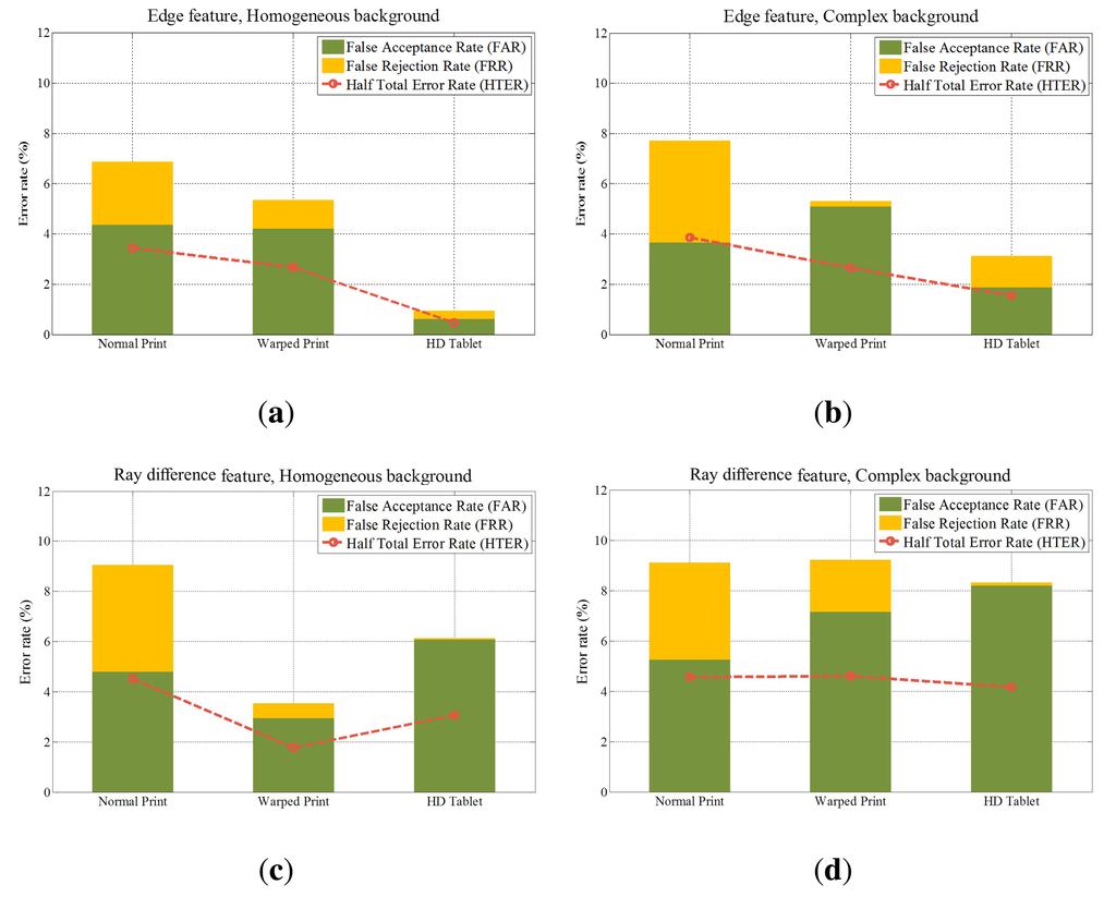 Overall, edge feature has better performance than ray difference feature. Unlike ray difference feature, edge feature is extracted from the salient region (microlens images at defocused edge). Therefore, unnecessary information and noise in edge feature are relatively smaller than those in ray difference feature. Figure 22 illustrates light field photographs of a real face, normal print and HD tablet. In case of the real face, the light distribution inside the microlens (Figure 22c) is represented as the inverse of the macroscopic light distribution, as mentioned in Section 2.2.1. However, in the normal print and HD tablet light field photographs, the property of the microlens image is imperceptible. Moreover, the light distribution in the HD tablet light field photograph is more irregular than that in the normal print. HD tablet emits light autonomously, unlike normal prints and warped prints. Thus, not only reflected lights but also emitted lights are recorded by the light field camera. This widens the gap between edge features of the real face and fake face in the HD tablet. As a result, error rates under HD tablet attacks are smaller than other error rates. HTERs of edge feature under normal print attacks are 3.39% (homogeneous background) and 4.10% (complex background). Meanwhile, HTERs of edge feature under HD tablet attacks are 0.89% (homogeneous background) and 1.09% (complex background). Edge feature shows the strength against HD tablet attacks.