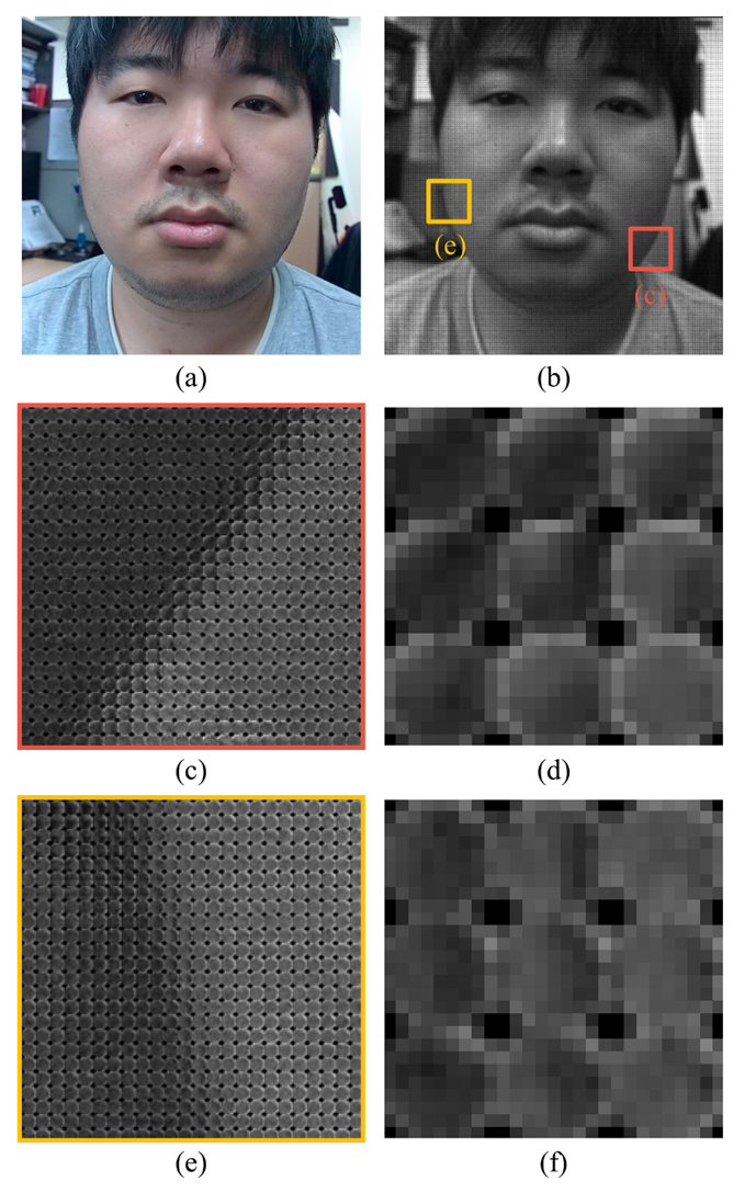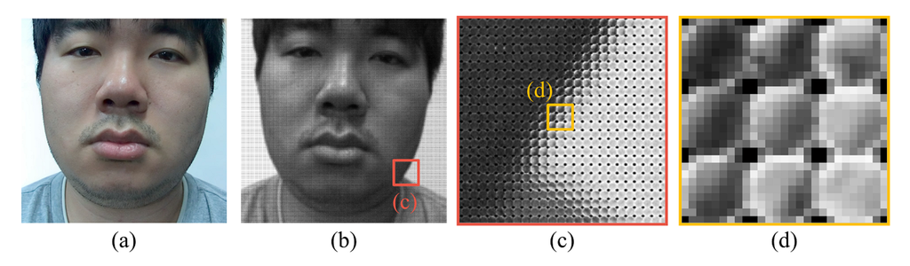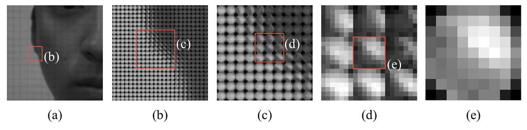 Figure 4 is our own sample of magnified views of Figure 2. The focal plane of the original light field photograph lies on the nose tip. Figure 4a is a region of the left ear and chin, and Figure 4b is the macroscopic image of Figure 4a. Figure 4e is the microlens image that lies on the edge of the ear, and Figure 4d illustrates adjacent microlenses of the microlens Figure 4e. Microlenses on the edge of the ear are farther than the focal plane. Therefore, the inversion of the incident rays occurs. The light distribution inside Figure 4e is opposite to the light distribution of the macroscopic image in Figure 4b. Depending on the location of the focal plane, microlenses can have different features. In this paper, we extract a feature descriptor based on this characteristic of the microlens image. We will mention it minutely in Section 3.1.1.