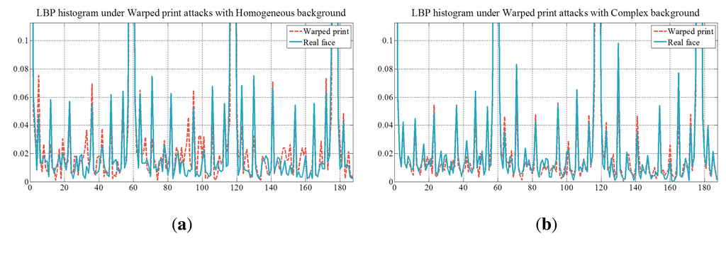 The existence of the background also affects the performance. Figures 23 and 24 show microlens images of real faces with a homogeneous background and a complex background. When the background is homogeneous, the variation of the pixel values in a microlens image (Figure 23d) is large. However, the variation of the pixel values in a microlens image with the complex background (Figure 24d,f) is small. In Figure 24c,d, there is a locker whose color is similar to the skin color in the background. Also, when the intensities of the background and the skin are similar (Figure 24e,f), the pixel values in the microlens image are not discriminative. Due to the less variation of the pixel values in the microlens image with the complex background, it is more difficult to find the boundary between the face and the background in the microlens images, and variances of the microlens images are not so distinctive either. Figure 25 illustrates the cumulative distributions of variances under normal print, warped print, and HD tablet attacks. When the background is homogeneous, cumulative distributions of real and fake faces are discriminative (solid lines). Whereas, cumulative distributions of faces with the complex background are less distinguishable relatively (dotted lines). The low variances of microlens images with the complex background affect to the distributions of edge features, and this phenomenon results in the deterioration of the performance. In the case of the ray difference feature, complex background also deteriorates the performance under the warped print and HD tablet attacks, as illustrated in Figure 21. Figure 26 shows local binary pattern histograms of real faces and warped prints. These histograms are yielded during the procedure of extracting ray difference features in Figure 17. The background of faces in Figure 26a is homogeneous, and that of faces in Figure 26b is complex. Blue solid lines are LBP histograms of real faces, and red dotted lines are those of warped print attacks. When the background is homogeneous, the gap between LBP histograms of real face and warped print is large. However, the gap in the complex background is smaller than that in the homogeneous background. Because of the small gap, it is more difficult to discriminate real faces and warped prints. We can also check the influence of the background through an additional experiment. As described in Figure 27, we exclude the subregions that correspond to the background (Figure 27e,f). From subregions including the background (Figure 27a,b) and those excluding the background (Figure 27c,d), we extract ray difference features and classify the warped print attacks. When the subregions of the background are included in the process of extracting ray difference features (Figure 27a,b), the accuracy under the warped attack with the complex background (97.75%) is lower than the accuracy under the warped attack with the homogeneous background (99.22%). However, if the subregions of the background are excluded like Figure 27c,d, the performance is similar regardless of the type of the background (Table 5). Therefore, the performance under warped print attacks with the complex background is more deteriorated than that under warped print attacks with homogeneous background.