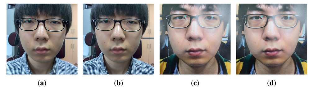 Kim [27] proposed a countermeasure to spoofing attacks using variable focusing. Depending on the degree of defocussing, the depth between the nose and ears is estimated, and the defocus is used as a criterion to discriminate real and fake faces. Therefore, it is important to make the effect of defocussing great. This method requires two images whose focal planes are different. The focal plane of the first image lies on the nose tip, and that of the second image lies on the ears. In [27], those images are taken using a mirrorless camera. However, in this comparison, images are yielded from the light field photograph through the refocusing process. Refocusing means that users adjust the focal plane after taking pictures. This enables users to generate several refocused images from the only one light field photograph. Figure 28 illustrates refocused images made from the light field photographs. Figure 28a,b are real face images, and Figure 28c,d are fake face images. The focal plane of Figure 28a,c lies on the nose tip, and that of Figure 28b,d lies on the ears. With these refocused images, we conducted experiments for comparison with [27].