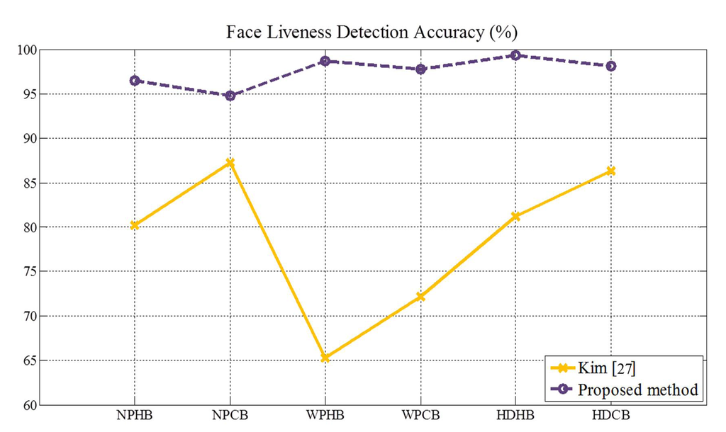 Figure 29 and Table 6 present the results of two methods under normal print, warped print and HD tablet attacks. We computed the accuracies using both features. Like the process of classification explained in Section 3.2, we applied edge and ray difference features as the parallel structure, depending on the quantity of the edge. Our method acquires at least 94.78% accuracy or up to 99.36% accuracy. On the other hand, the best accuracy of [27] is 87.26%. The performance of our proposed method is superior to that of [27]. The reason why the performance of [27] is relatively low is that the effect of defocussing in refocused images is insignificant. In order that the remarkable degree of defocussing is obtained, depth of field (DoF), the range between the nearest and farthest objects in a given focal plane, must be sufficiently shallow, or the focal plane of the first refocused image must be far from the focal plane of the second refocused image. However, neither of the two conditions are satisfied. The light field camera can extend the DoF without decreasing the numerical aperture of the camera [50], but it is difficult to reduce the DoF. In addition, as the focal plane of the first image lies on the nose tip and that of the second image lies on the ears, the gap between the focal planes is not large, and DoFs are overlapped. Therefore, there is little difference between the two refocused images. This influences the performance of [27] to be deteriorated, and this is the reason why we avoid using refocused images for face liveness detection. Moreover, the performance of [27] under warped print attacks is the worst. This shows that [27], originally targeted at detecting 2D flat photo, is prone to warped print attacks. As a result, those accuracies are relatively low compared with other accuracies. Whereas, the performance of our proposed method is stable, regardless of types of spoofing attacks.