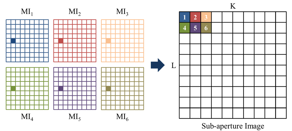 Sub-aperture images [49] are made by reordering incident rays in the raw light field photograph. Figure 5 illustrates the process of making a sub-aperture image. Each sub-aperture image is composed of the pixels of same position selected from each microlens image. According to the location of the pixel, multiview sub-aperture images can be obtained and have different information of incident rays respectively. The conventional photograph is equal to the integration of all sub-aperture images, summing all the incident light.
