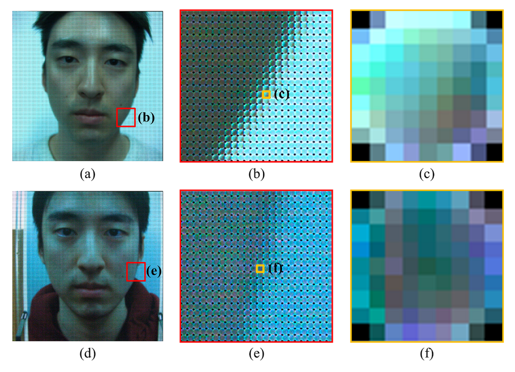 Edge feature is based on the characteristic of the microlens image. As mentioned in the previous section, microlens images have different distributions of lights, according to whether the corresponding area is on the focal plane or not. We focus on this property to classify real and fake faces. Real faces have a depth gap between the nose and ear areas. However, fake faces, such as 2D flat photos and warped photos, have relatively little difference between the depths of the nose and the ear. This feature is checked in the microlens images of the raw light field photographs. Figure 6a,d are raw light field photographs of real and fake faces. The focal planes of those pictures are on the nose. Figure 6b,e are microlens images near the chin, and Figure 6c,f are the examples of microlens images corresponding to the chin of the real and fake faces respectively. The microlens image of the real face (Figure 6c) is not full of lighting rays and has a gradational variation of pixel values as if there is a short edge. However, the microlens image of the fake face (Figure 6f) has randomly uniform distribution. Likewise, we can make it clear to distinguish real and fake faces by inspecting microlens images.