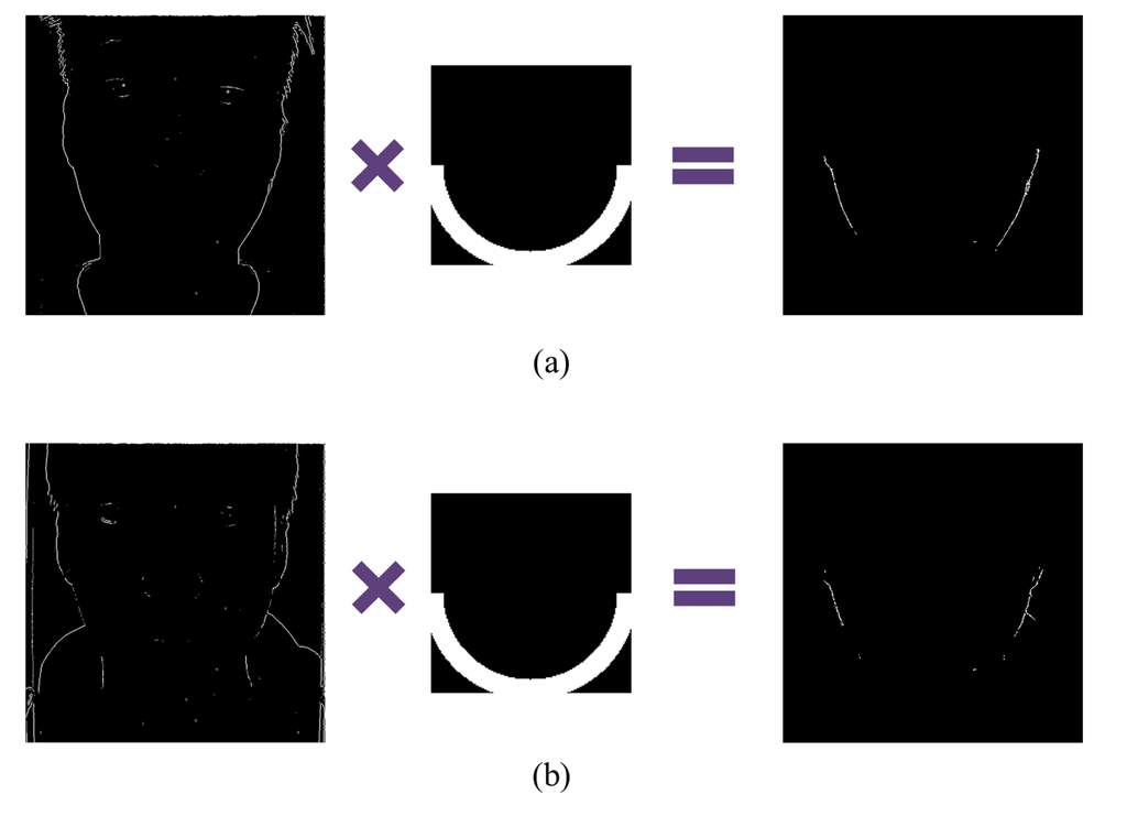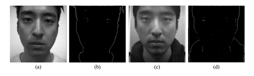 In order to detect edges, we make a sub-aperture image using a center pixel in microlens images. Figure 7a,c are sub-aperture images of real and fake faces respectively. For vertical edge detection, a sobel filter is applied to the green and blue channel images whose noises are smaller than the noises in the red channel image. In Figure 7b,d are vertical edges of real and fake faces. Among extracted edges, there are irrelevant edges which may cause confusion in distinguishing fake faces. In order to filter unnecessary edges out, a semicircular mask is adopted to detected edges. Figure 8 shows results of masked edges of real and fake faces. Afterwards, we arrange microlens images corresponding to the selected edges. Through this process, we can choose microlens images which must be analyzed.