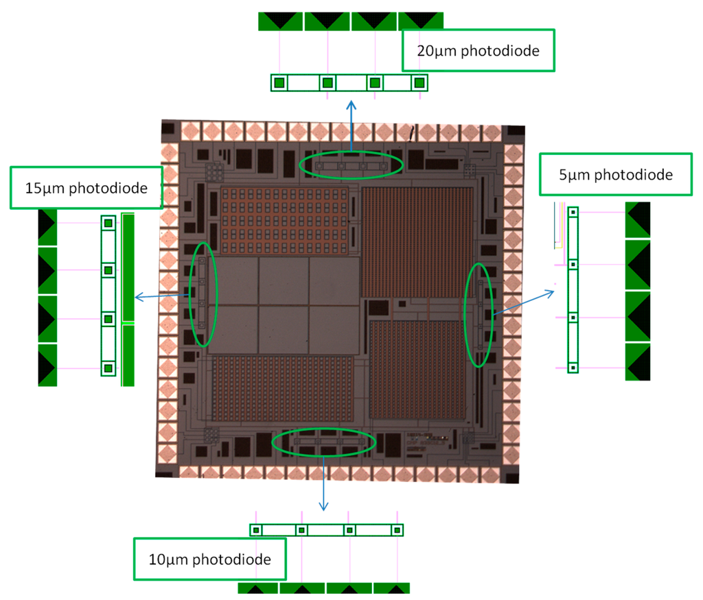 - Rochas, A.; Besse, P.A.; Popovic, R.S. A Geiger mode avalanche photodiode fabricated in a conventional CMOS technology. Proceedings of the IEEE European Solid-State Devices Conference, Nuremberg, Germany, 11–13 September 2001; pp. 483–486.