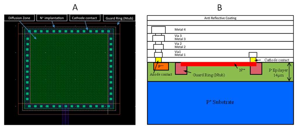 Figure 2 shows the layout and the cross-section of the photodiode implemented in the AMS 0.35 μm Opto process. Note that in designing such a device, only standard masks provided by the technology are used. The photodiode depicted in Figure 2A is an n/p junction with a thin n layer (about 0.2 μm thick of arsenic) deposited on the p epi-layer (about 14 μm thick of boron); the n layer corresponds to a doping of approximately 1 × 1020 at·cm−3. A strong and uniform electric field within the depletion region allows for the avalanche formation and the single photon sensitivity of the photodiode. This field must be distributed as uniformly as possible at the center of the junction. Moreover, the photodiode periphery must be protected to prevent premature breakdown. To avoid this detrimental effect, the photodiode must be surrounded by a suitable guard ring (GR). Two main families of guard rings designs are available from literature: for 0.35 μm CMOS processes and above, guard rings generally consist of a lesser doped region (n-well structures or p-well implants) surrounding the active part of the photodiode and thus lowers the electric field at the borders of the diode to avoid premature edge breakdown [4,12]. For modern technologies (beyond 250 nm), the use of Shallow Trench Isolation (STI) as the guard rings was introduced and proposed as the most promising alternate to conventional guard rings [13,14]. In our designs, the guard ring structure is based on an explicit low-doped implanted n-well region (of about 3.5 μm thick phosphorus) that surrounds the periphery of the multiplication region of the photodiode as shown in Figure 2B. In this case, the corresponding breakdown voltage of the volumetric region (active area/epi-layer junction) is estimated to be 12 V depending on photodiode size and wafer homogeneity. Breakdown voltage of GR/epi-layer junction is estimated to be 35 V.