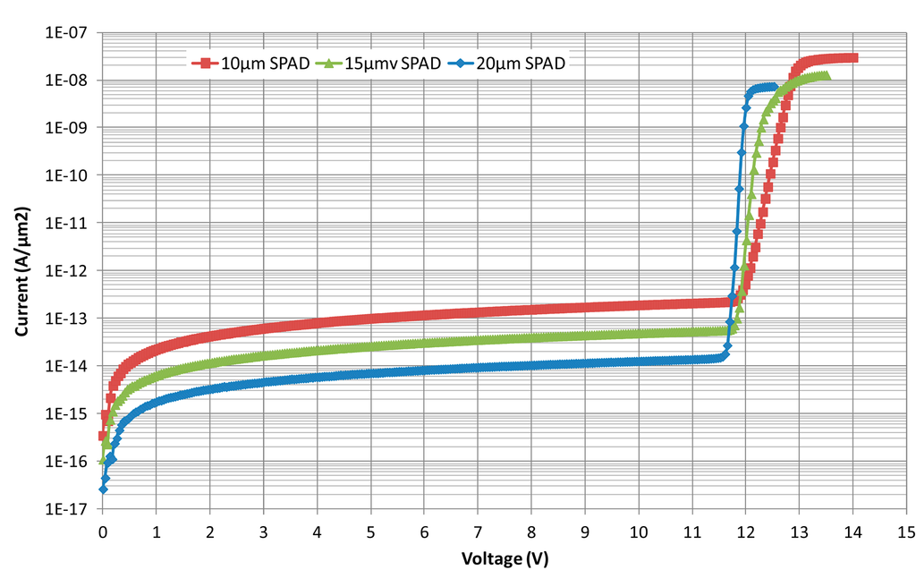 Figure 4 shows measured I-V characteristics of the different SPADs per area unit (A/cm2) in reverse mode. As previously mentioned, the 5 μm photodiode has been deliberately rejected because of its high breakdown voltage and its high dark current in comparison to its surface. Therefore, Figure 4 focuses only on typical 10, 15, and 20 μm devices. They exhibit abrupt breakdown around 12 V, at 12 V, 11.8 V, and 11.7 V, respectively. It shows that the breakdown voltage tends to reduce with increasing the device size. Such results are similar to those obtained with a 130 nm technology [15].