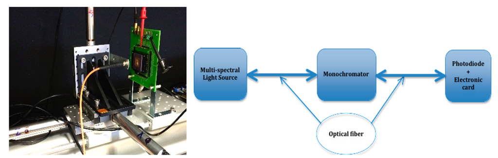 The sensitivity of the SPADs structures has been measured over the visible range at different overvoltages, by means of a dedicated test bench including a multi-spectral light source (B&W Tek BPS120-CC), a monochromator (Spectral Products CM110) for the selection of precisely one wavelength, and an optical power meter (Newport 1830-R with 918D-SL-03D Silicon Detector) as shown in Figure 6.