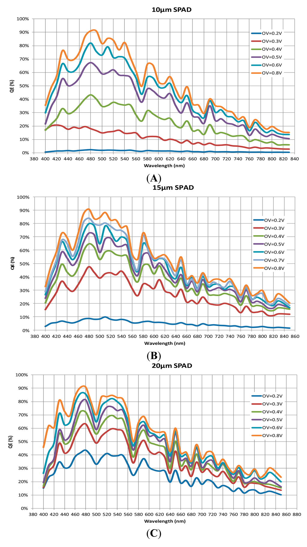 Using such a protocol, we are able to precisely compare quantum efficiency (QE) of each size of photodiodes over wavelengths in the range (400 nm, 820 nm) and overvoltages in the range (0, 1 V), as depicted in Figure 7. The three different photodiodes achieve peaks in the blue region (around 480 nm) of the visible wavelength range. This value is comparable with previous results obtained with the same 0.35 μm technology [16,18,21]. The efficiency remains high over a large range of wavelengths, above 50% between 410 nm and 640 nm for overvoltages higher than 0.4 V. Note that, for all the subsequent results described in this paper, the wavelength has been fixed to 480 nm.