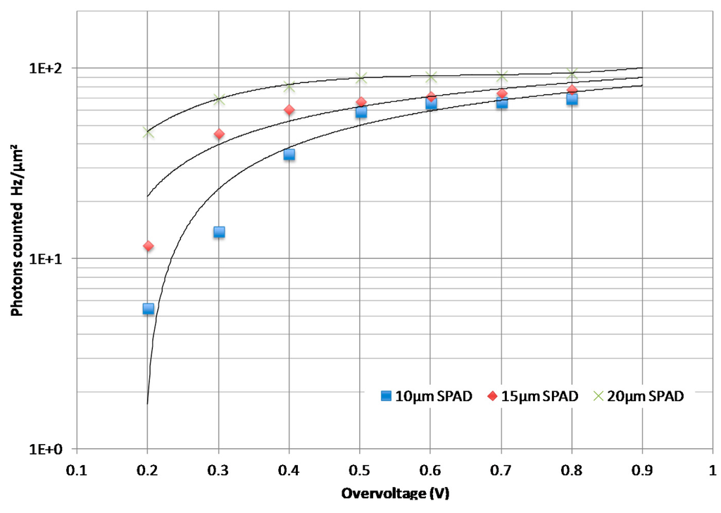 Figure 5 shows the raw DCR of the three different fabricated SPADs as a function of the overvoltage. Passive quenching is being used in the implemented SPADs. DCR increases with overvoltage and with photodiode size. DCR vary from 0.3 kHz (10 μm) to 8 kHz (20 μm) at 0.2 V excess bias and from 7 kHz (10 μm) to 13 kHz (20 μm) at 1.1 V excess bias, respectively. The 20 μm photodiode presents the highest DCR whereas the two other photodiodes (10 μm and 15 μm) have both very close DCR.