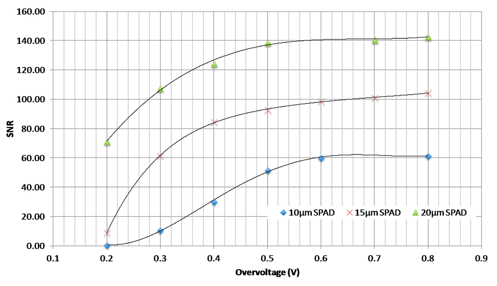 We also evaluated the Signal to Noise Rate (SNR) for each photodiode as a function of overvoltage [22], as seen on Figure 9. The SNR is calculated using the following equation: