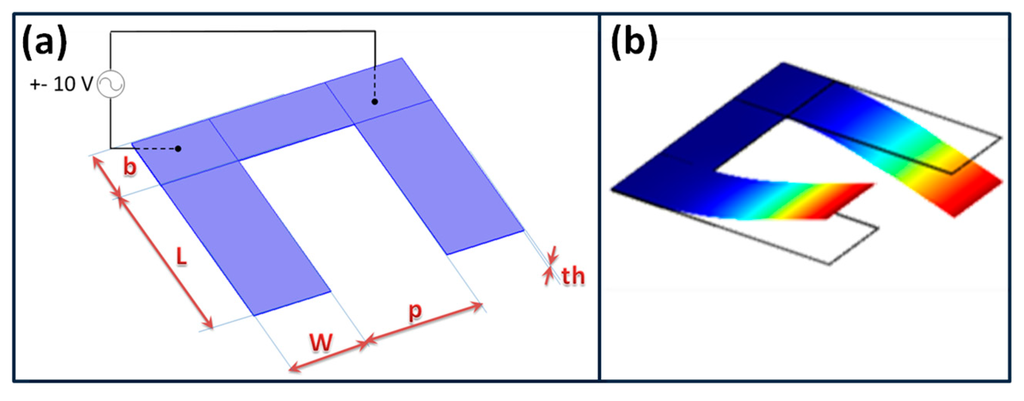 In this study we consider the coupling cantilevers vibrating in an antisymmetric bending mode, whose amplitude variation is higher than the symmetric mode. The resonance frequency depends on the geometry of the two cantilevers and Young's modulus E. The geometry of the device is given in Figure 1a. With the following dimensions L = 100 μm, w = 10 μm, th = 2 μm, p = 20 μm and b = 20 μm, the first antisymmetric mode (Figure 1b) resonance frequency fR is obtained at fR = 109.468 kHz.