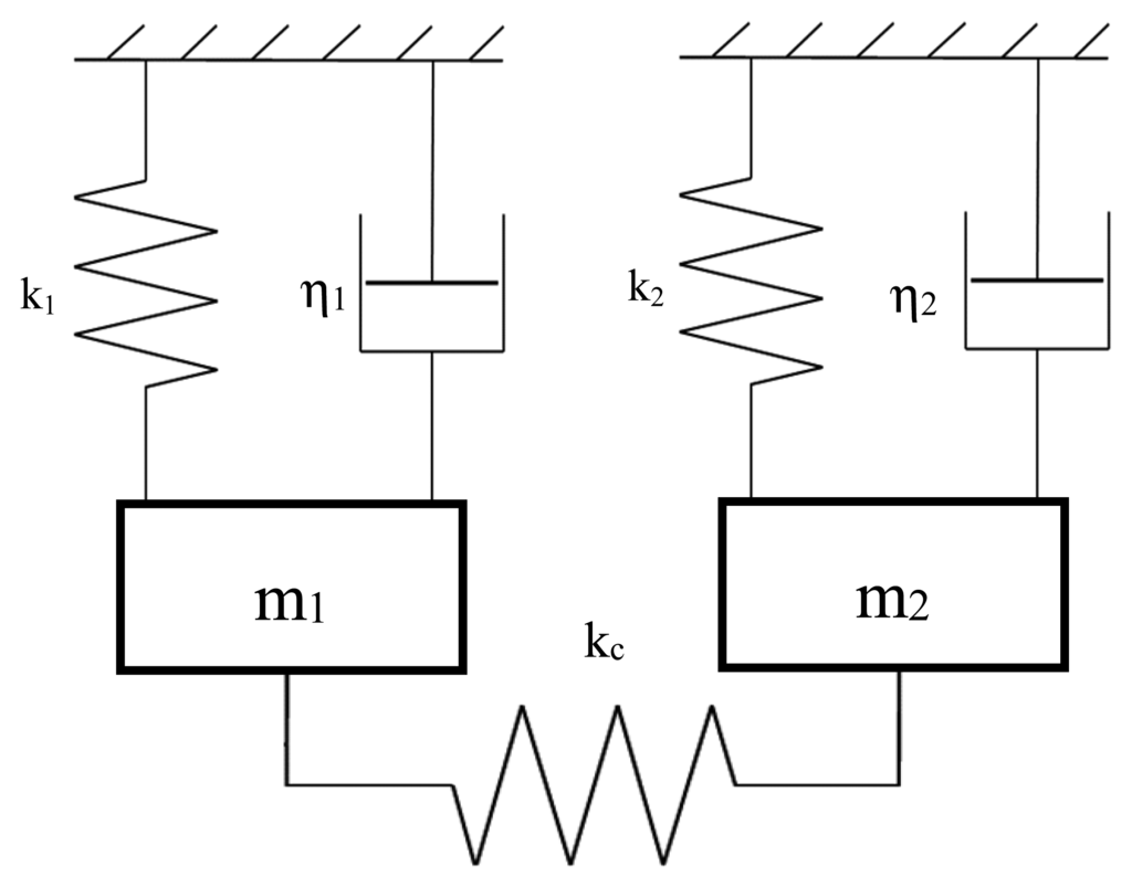 The current study is based on the microcantilever structures which have been previously demonstrated as suitable and inexpensive compared with other structures for biological field applications. Silicon, quartz or polymers are the most commonly used materials used in making microcantilevers, with typical dimensions ranging from tens to hundreds of micrometers long, widths of tens of micrometers, and hundreds of nanometers thick. In this study, cantilevers were made of GaAs which allows direct biofunctionalisation. A schematic of two identical cantilevers denoted as 1 and 2 and coupled by means of an overhang is shown in Figure 1a. The underlying physics of this system can be represented by the discretized model given in Figure 2. Each cantilever is modeled as a damped oscillator while the effect of the overhang coupling is modeled as a spring connecting the two oscillators. k1 and k2 are the bending stiffness of the oscillators and m1 and m2 are the suspended masses. Δm is the added mass due to binding molecules. kc is the stiffness of the overhang coupling of the two cantilevers. If we consider two identical cantilevers, the eigenvalues problem governing the undamped free oscillations of the device can be written as follows [19]:
