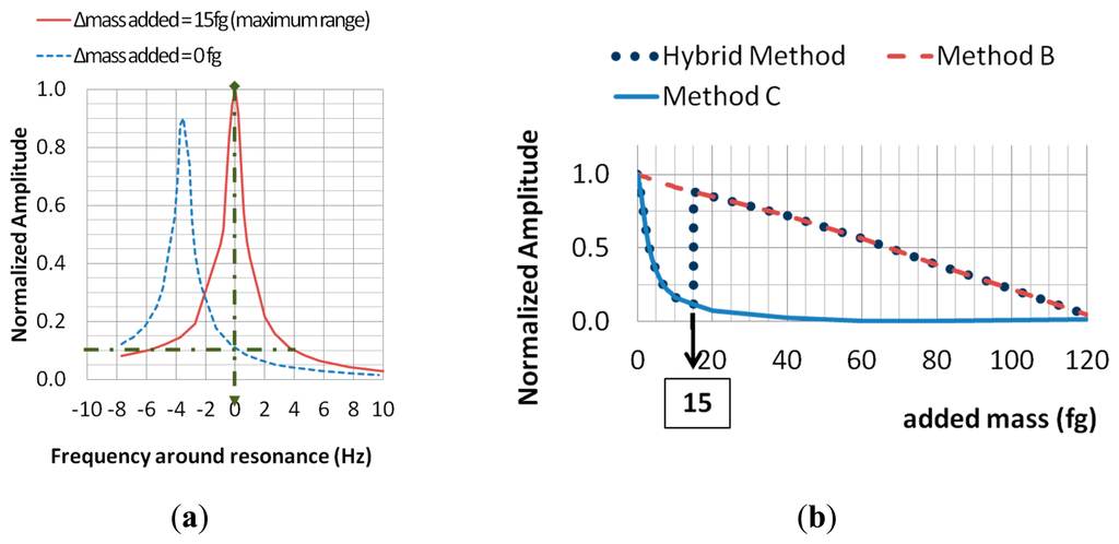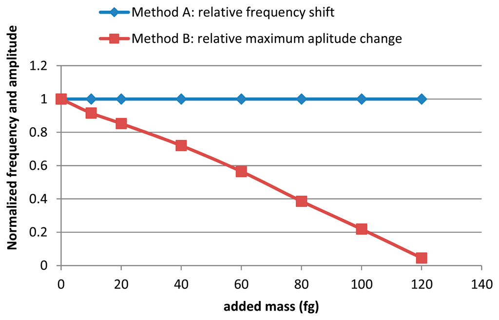 As the operating range is small, we propose to use a hybrid method to exploit the good performances of C-method when we are concerned with very weak added mass (see Figure 5b). Over the operating range without modifying the device we propose to use method B. With our device, the threshold for switching between the two methods is for Δm = 15 fg, which corresponds to a relative variation in the maximum deflection of 11.5%.