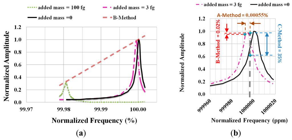 Method C is valid as long as there is a monotonic overlap of the resonance peak with added mass and the resonance characteristic at initial weight. In the case of Figure 5a, we have ΔfR(Δrelative amplitude change = 10%) = 4 Hz and the operating range is equal to 15 fg. It may be noticed that if the resonance curve has a better quality factor, then the resolution increases but the operating range decreases.