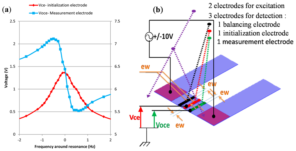 To adapt the previous methods we used a device with a piezoelectric excitation and detection. Unlike optical methods piezoelectric ones allow measurement of resonance peaks with the appearance of an even or odd differentiable function. The appearance depends on the electrode position on the overhang. According to a study parameterized in frequency on the voltage change within the coupling element, we determined that we need to deposit an electrode at the coupling element center of the microcantilevers. The electrode is a gold layer which thickness is 50 nm and area (b × ew = 8 μm × 1.5 μm). The signal delivered by this electrode is an even function. Nevertheless, an off center electrode provides an odd function. As shown in Figure 6b, the device is composed of three electrodes. The balancing electrode helps keeping the symmetry of the device.