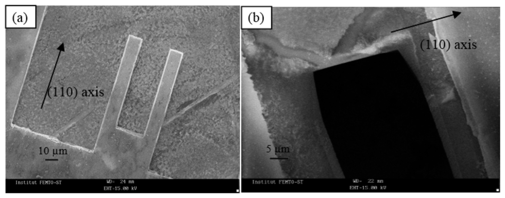 Small samples were cut into 500 μm squares by sawing from a 600 μm thick wafer of GaAs (wafer diameter of 3 inches). Prior to the deposition of gold/chromium electrodes, the GaAs surface was deoxidized with an HCl based solution. Gold/chromium layers were deposited on the upper face of the wafer by sputtering and lift-off technique was used for electrodes patterning. A chemical thinning process is applied to the sample using 7 H3PO4:5 H2O2:8 H2O solution [26] and the temperature of the etchant was maintained at 0 °C ± 0.2 °C for an efficient control of the etching depth. After this step the sample thickness was 20 μm. A photolithographic process followed by etching was performed. It was carried out using two successive wet etchings with an orthophosphoric acid-based solution 1 H3PO4:9 H2O2:1 H2O maintained at 0 °C ± 0.2 °C with ultrasonic stirring. The first one allowed thickness control and the second one was used to make the cantilevers. The choice of wet etching baths and the etching conditions are detailed in [26]. Figure 7 gives SEM views of the cantilevers that were obtained after chemical etching. In the SEM image, the inert mask covered the surface of the device. Figure 7a shows the device whereas Figure 7b gives information on the shape under the mask near the clamping positions of the beams. The analysis of etching shapes revealed a large underetching under the mask and convex undercutting at the free end of the cantilever. The lateral sides of the beams are not constituted by vertical walls but by inclined blocking facets and the cross sections of the beam are then not squares.