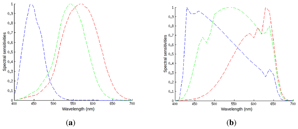 - Jiang, J.; Liu, D.; Gu, J.; Susstrunk, S. What is the Space of Spectral Sensitivity Functions for Digital Color Cameras? Proceedings of the IEEE Workshop on Applications of Computer Vision (WACV), Tampa, FL, USA, 15–17 January 2013; IEEE Computer Society: Washington, DC, USA, 2013; pp. 168–179. [Google Scholar]