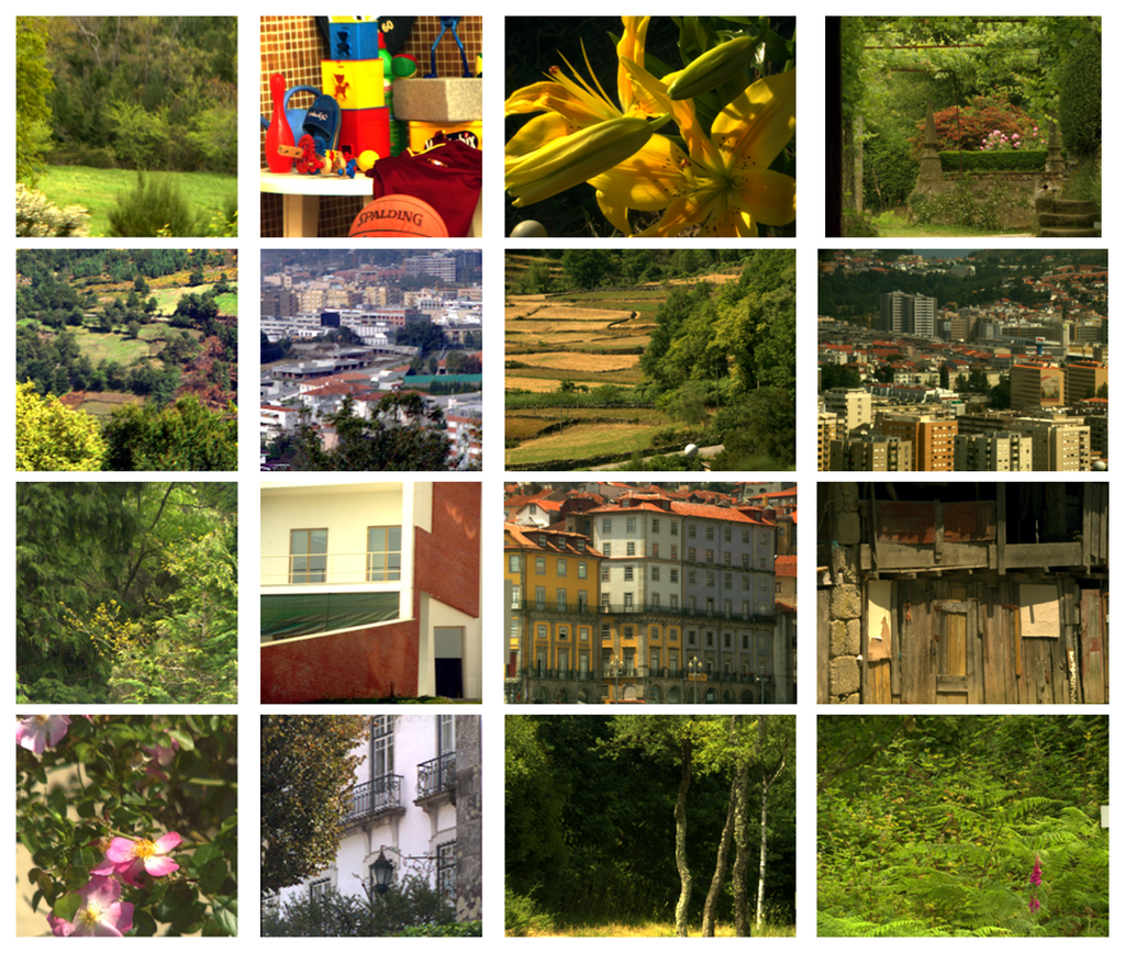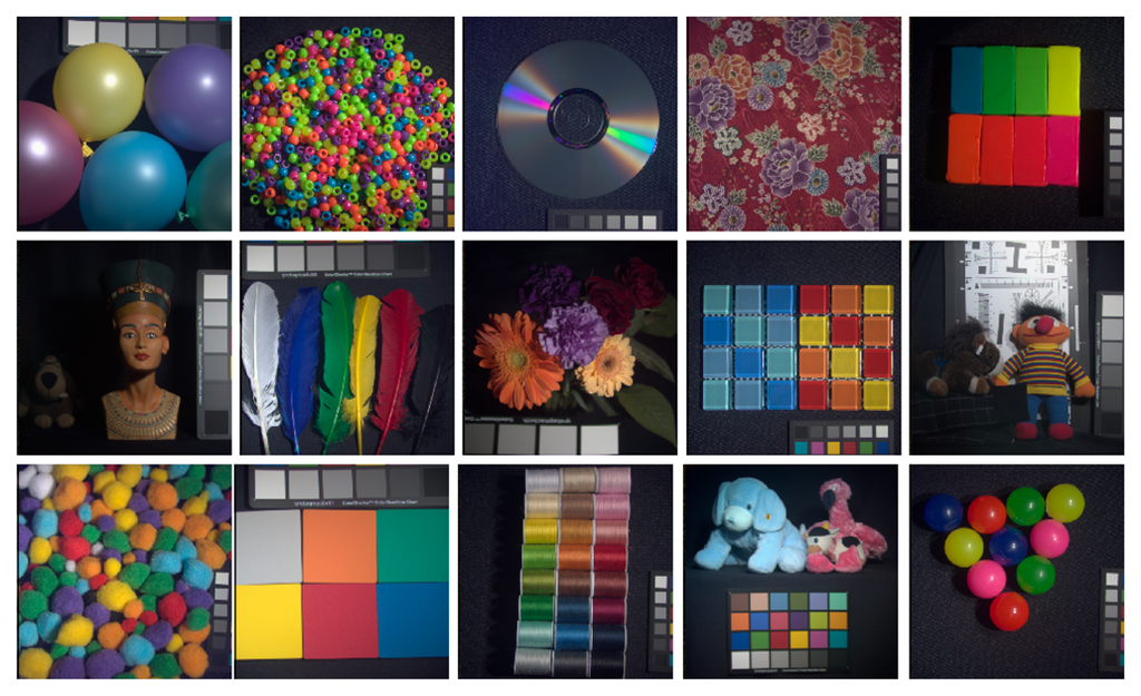 Given that S-CIELAB is applied to images, for the purposes of our experiments, it is important to use meaningful images and meaningful illumination. To this end, we have used three different datasets: the 16 hyperspectral images obtained by Foster et al. [40], which contain a range of man-made objects, natural landscapes and both indoor and outdoor scenes, the 15 images labeled as “stuff” obtained by Yasuma et al. [41], which contain a range of very colorful objects, and the combination of both datasets. We have calculated color signals using the D65 illuminant. The 16 images of the first dataset are presented in Figure 9, while the 15 images of the second are presented in Figure 10.